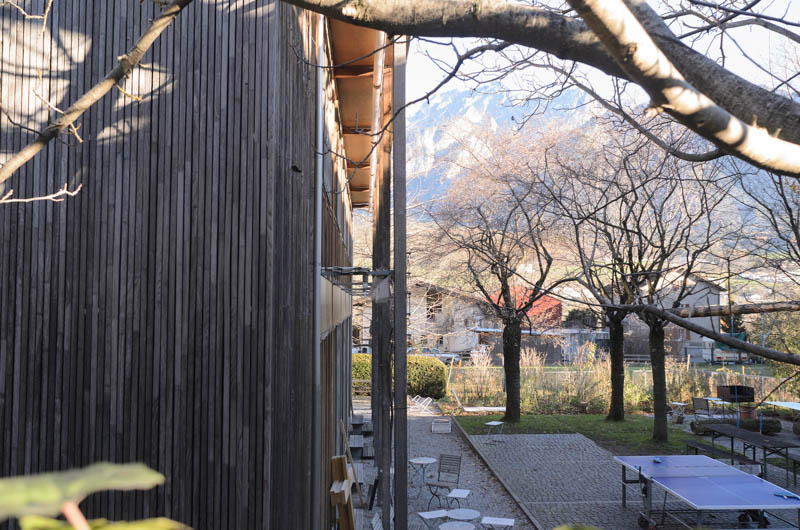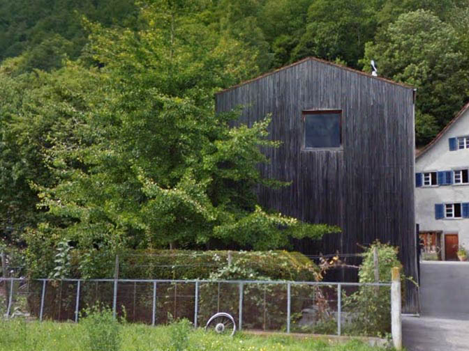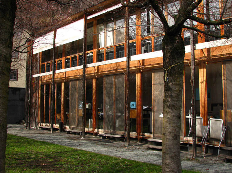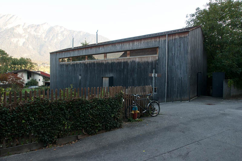The Studio was built for Zumthors architectural practise in Haldenstein and finished in 1988. It is a simple wooden building with three floors. The cellar is completely underground and served as an archive, while the first floor was a "garden room" and the second floor a drawing room for the architects.